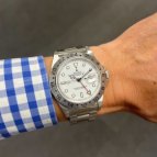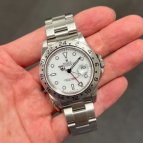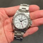 ホワイト文字盤のスポーツモデルが欲しかったのですが、種類は意外と少なく、デイトナは予算オーバーで手頃なものを探していたところエクスプローラーIIを発見。現行モデルとも悩みましたが、私の手首にフィットするのはコチラでした。ホワイト文字盤は清潔感があって、スーツにも合わせやすく重宝しています。