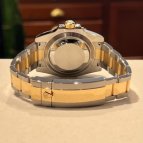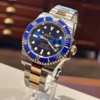Ref.16613の次期モデルとして、デザインは受け継ぎながらも、耐蝕性と、耐傷性に優れたセラミックベゼルを搭載し、2009年に誕生したサブマリーナーがこのRef.116613LB。通称“青サブ”と呼ばれ、数多くある18Kコンビモデルの中でも、人気・知名度ともに非常に高いモデルである。水深300m(1,000フィート)でも信頼性と精度が保証されるといった長いサブマリーナーの歴史を受け継ぎながらも、随所に新しい技術を取り入れ、サブマリーナー・コンビ史上、最も高級感の溢れるデザインと耐久性で確固たる人気を築いている。ケースラグ部分の大型化によりさらに耐久性を高め、独自開発されたブルーパラクロムヒゲゼンマイの採用で耐磁性・耐衝撃性が向上。ベゼルにはイエローゴールドの特殊コーティングが施された60分の目盛りが刻まれ、潜水時間と減圧停止を正確に測定することが可能。