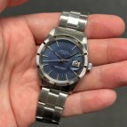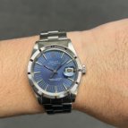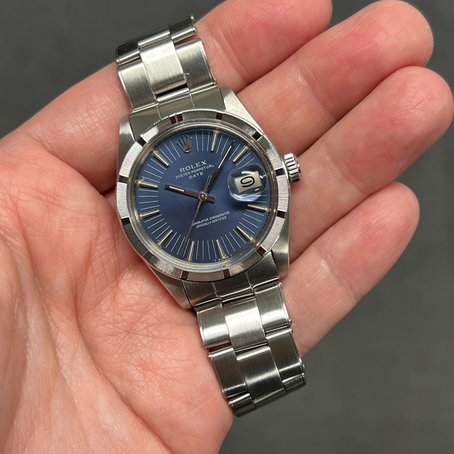 今まで、青サブやエクスプローラー系など、スポーツモデルを装着していましたが、自分の産まれ歳に近く,珍しいベゼル&ブレスの『青い1501』を見付けた瞬間、『これだ!』と思いました。